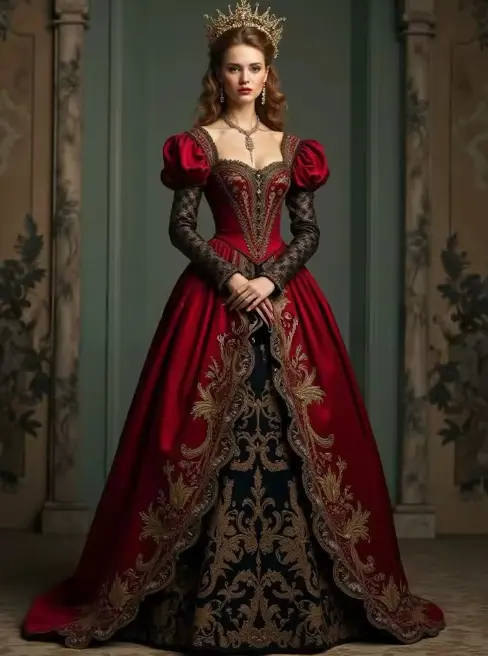Die Herzkönigin trägt ein opulentes Kleid in tiefem Dunkelrot, kombiniert mit edlen schwarzen Nuancen. Das Design ist inspiriert vom barocken Hofstil: prächtige Stoffe mit schweren Ornamenten, detailverliebte Stickereien und ein betont königlicher Schnitt. Im Mittelpunkt steht der ikonische, gefältelte Stehkragen aus weißem Organza – ein sogenannter Mühlsteinkragen, der ihre Herrschaftsstellung unterstreicht. Puffärmel, Schnürmieder und ein ausgestellter Rock mit Herzelementen sorgen für eine eindrucksvolle Silhouette.