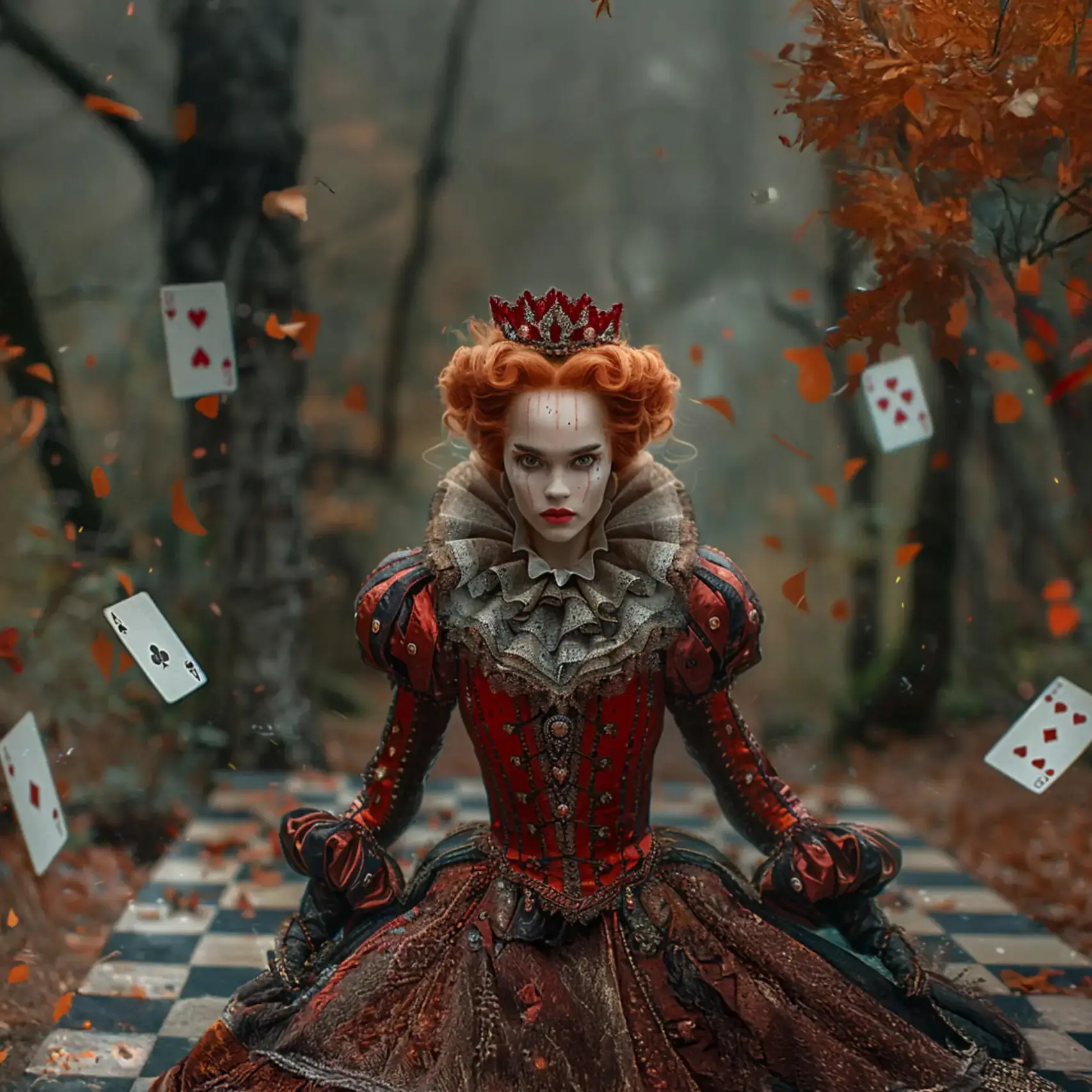 Inmitten eines verzauberten Waldes, umgeben von buntem Herbstlaub und moosbewachsenen Ruinen, erhebt sich die Herzkönigin in all ihrer exzentrischen Pracht. Inspiriert von Lewis Carrolls ikonischer Figur aus Alice im Wunderland, wird sie hier neu interpretiert – als prachtvolle, machtvolle Regentin zwischen Wahnsinn und Majestät, zwischen Fantasie und barocker Pracht. Diese Premiere lädt dazu ein, in eine schrille, märchenhafte Welt einzutauchen, in der alles möglich scheint – ein visuelles Spektakel voller Farben, Formen und verspielter Machtinszenierung.