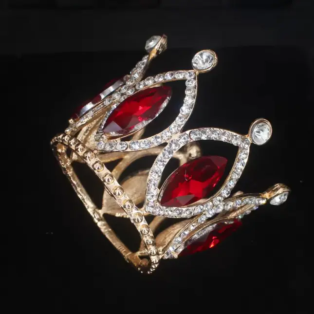 Dazu trägt sie elegante, bis zu den Ellbogen reichende Handschuhe, üppigen Gold- und Perlenschmuck sowie zahlreiche kleine Accessoires, die an ihre Spielkartenwelt erinnern: Broschen in Herzform, ein filigranes Uhrenmedaillon und ein Täschchen im Design einer Spielkarte. Nicht fehlen darf die hoch auftoupierte, leuchtend rote Perücke – inspiriert vom klassischen Look der Herzkönigin, kombiniert mit barocker Prachtfrisur. Gekrönt wird das Ganze durch eine auffällige Herzkrone, reich verziert mit Edelsteinimitaten und roten Kristallen.