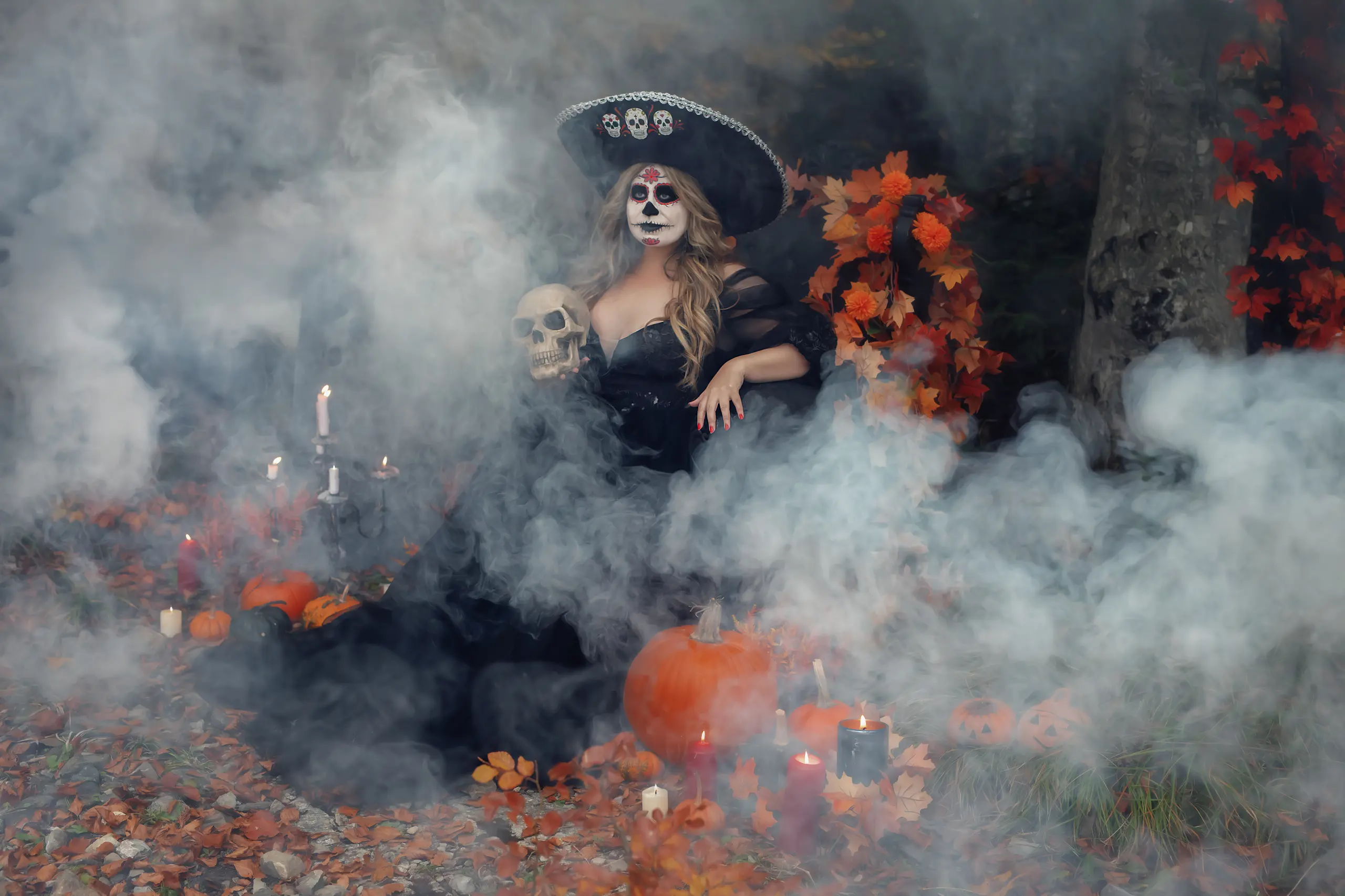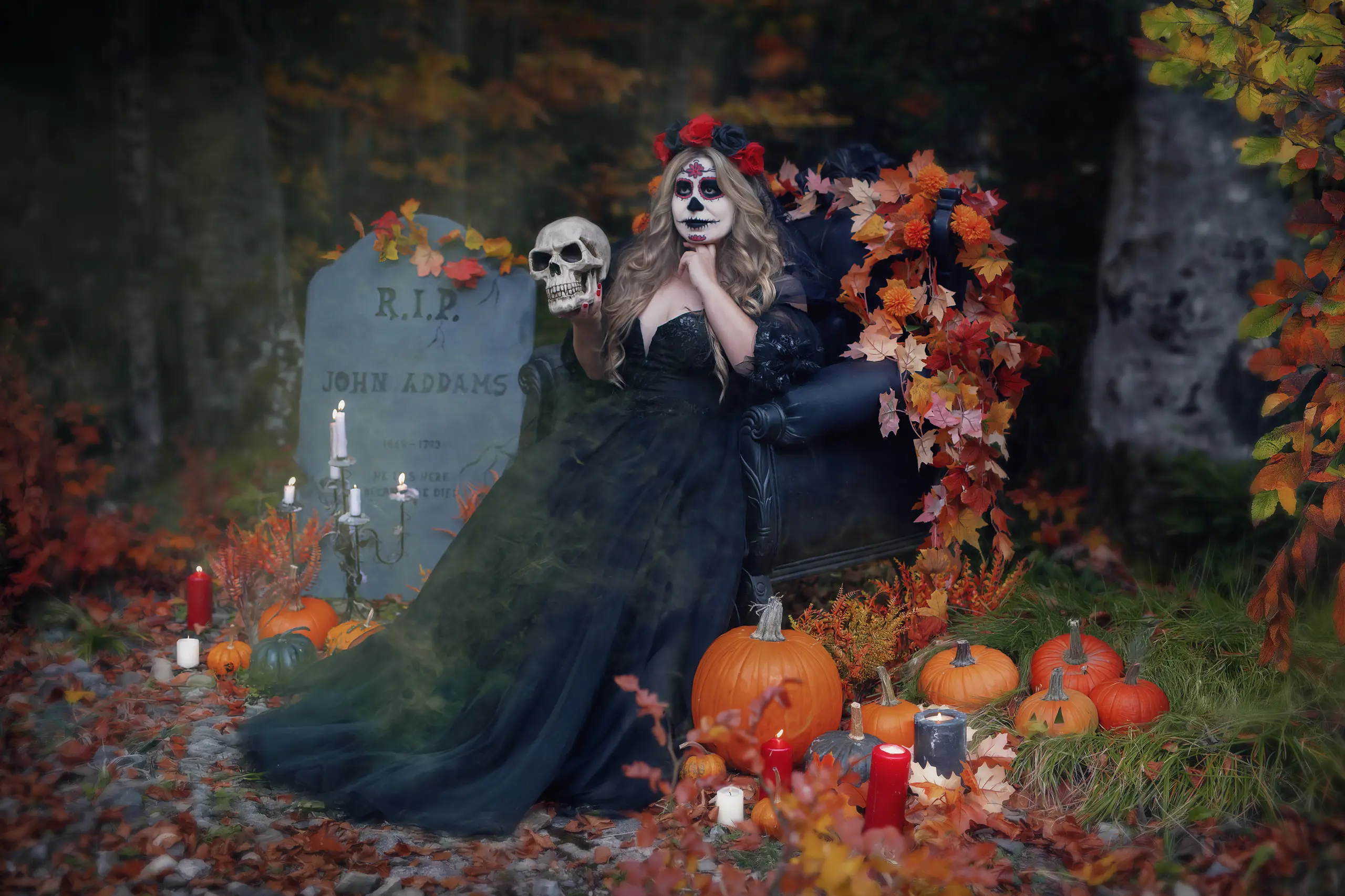 Der Herbstwald hüllt sich in eine düstere Stille, während die Schatten zwischen den kahlen Ästen tanzen, und auf einem finsteren Thron aus altem Holz, umwoben von verwelkten Blumen, verschmilzt du mit der melancholischen Atmosphäre der Vergänglichkeit. Kürbisse, Totenschädel und flackerndes Kerzenlicht schaffen eine geheimnisvolle Kulisse, die zugleich an vergangene Zeiten und alte Rituale erinnert. Dieses Shooting lädt dich ein, die Schönheit der Vergänglichkeit zu zelebrieren – eine Reise zwischen Leben, Tod und Erinnerung.