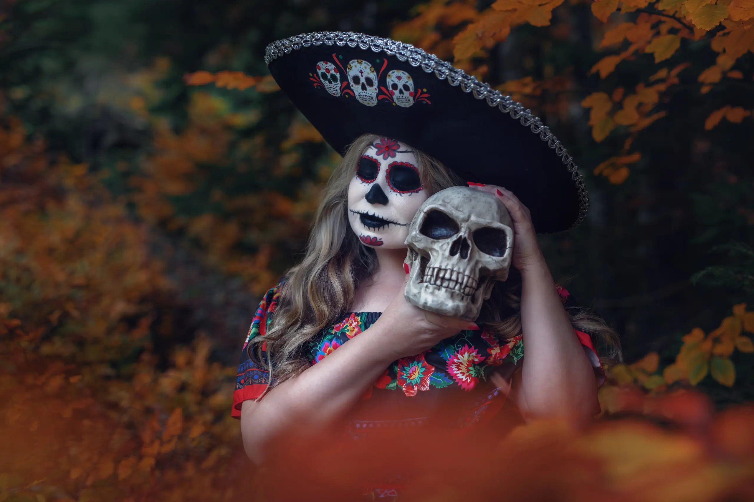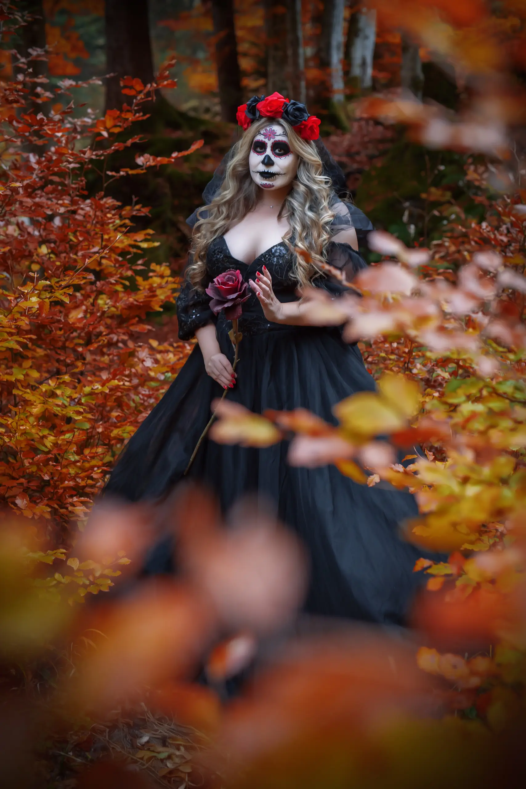 Das kunstvolle Make-up im Stil des Dia de los Muertos verwandelt dein Gesicht in eine filigrane Maske, die Vergänglichkeit und mystische Schönheit vereint während Dunkle Schattierungen, weiße Musterungen und feine Linien die markanten Gesichtszüge betonen. Deine Hände werden ebenfalls schwarz bemalt und weiße Musterungen bilden die Knochenstruktur nach. Eine lange, schwarze Perücke vollendet den Look und verstärkt die geisterhafte Ausstrahlung.