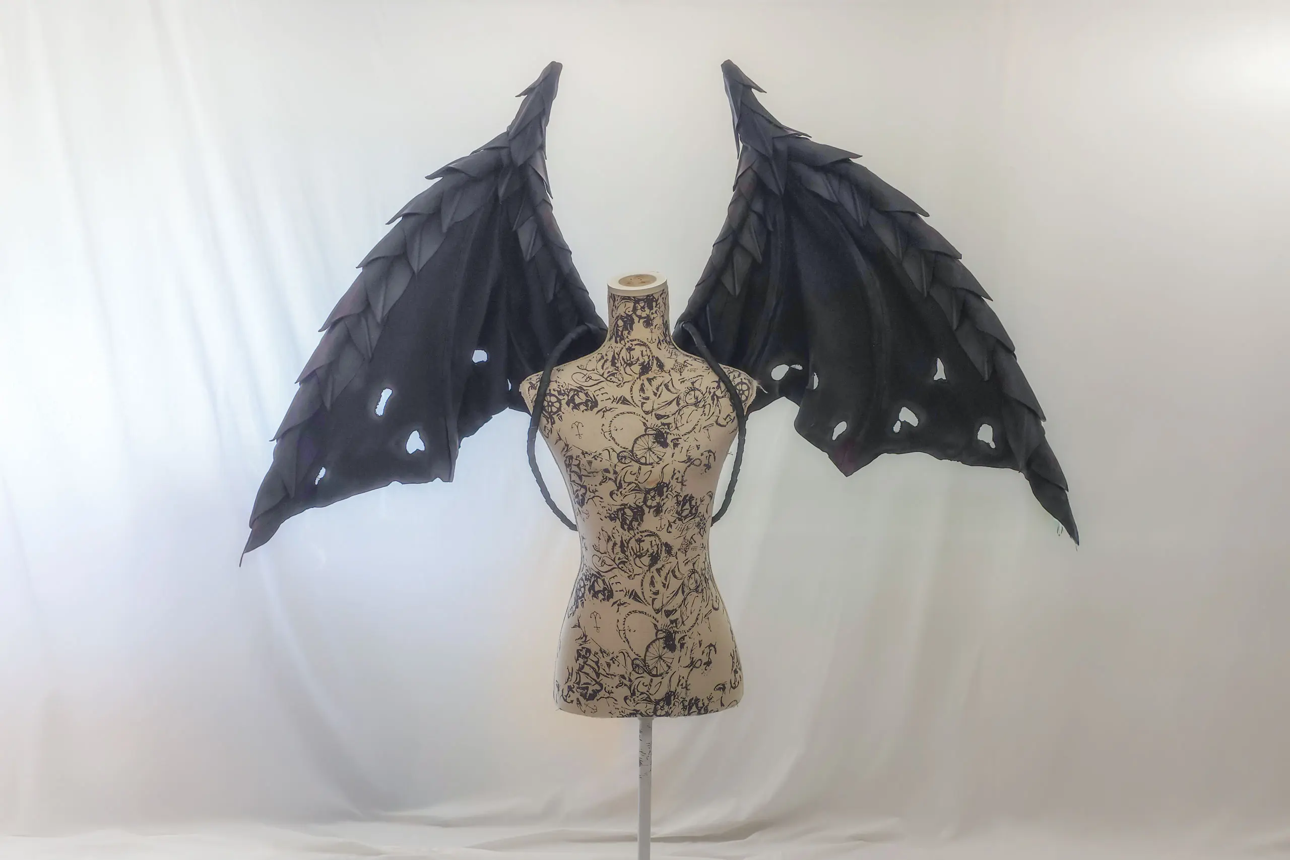 Zusätzlich entfalten sich große, fledermausähnliche Flügel. Sie breiten sich weit zu den Seiten aus und bilden den dunklen Gegenpol zur gleißenden Schneelandschaft, mächtig, rätselhaft und unantastbar. Abgerundet wird der Look durch eine schwarze, dezente Krone – sie wirkt, als wäre sie aus unzähligen kleinen Obsidianscherben gefertigt.