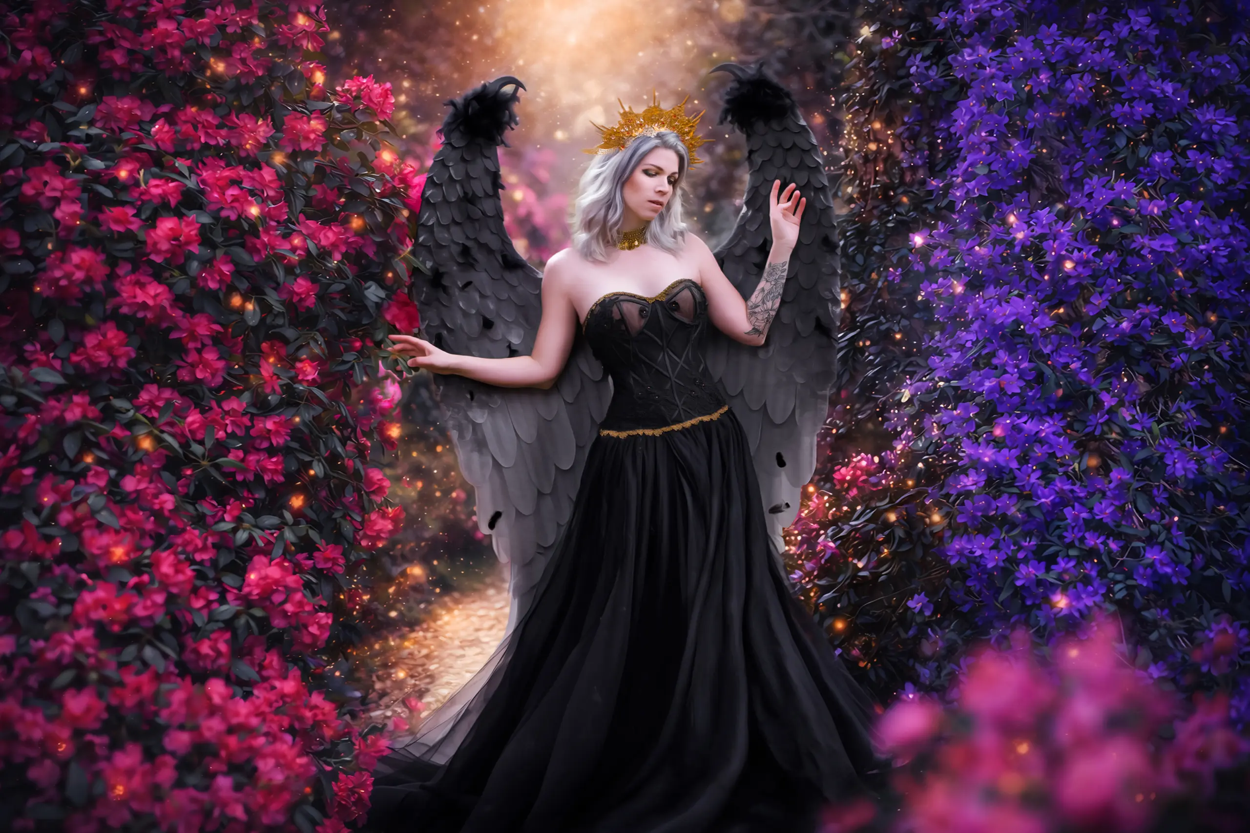 Für das Shooting kommt eine perfekte Studio-Lichtsetzung zum Einsatz, die die dramatische Wirkung des Outfits, Kopfschmucks und der Gadgets optimal betont. Nebelmaschinen sorgen für mystische Atmosphäre, während Ventilatoren oder Bläser leichte Windeffekte erzeugen, die Bewegung in Stoffe, Haare und Accessoires bringen und das Bild lebendig wirken lassen.