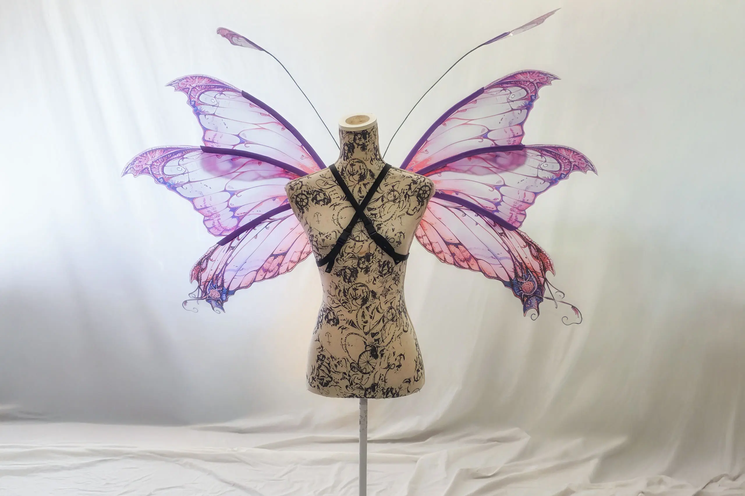 Diese Feenflügel gehören zu den ersten, die ich je besaß, und sie erfreuen sich noch immer großer Beliebtheit. Die magischen Eigenschaften des irisierenden Materials zeigen sich vor allem bei durchscheinendem Licht, wenn sie schimmernde rosa und grünliche Töne je nach Lichteinfall enthüllen. Ihr zauberhafter Effekt wird am besten inmitten eines Blumenmeers zur Geltung gebracht, wo sie die Farbexplosion noch zusätzlich hervorheben.