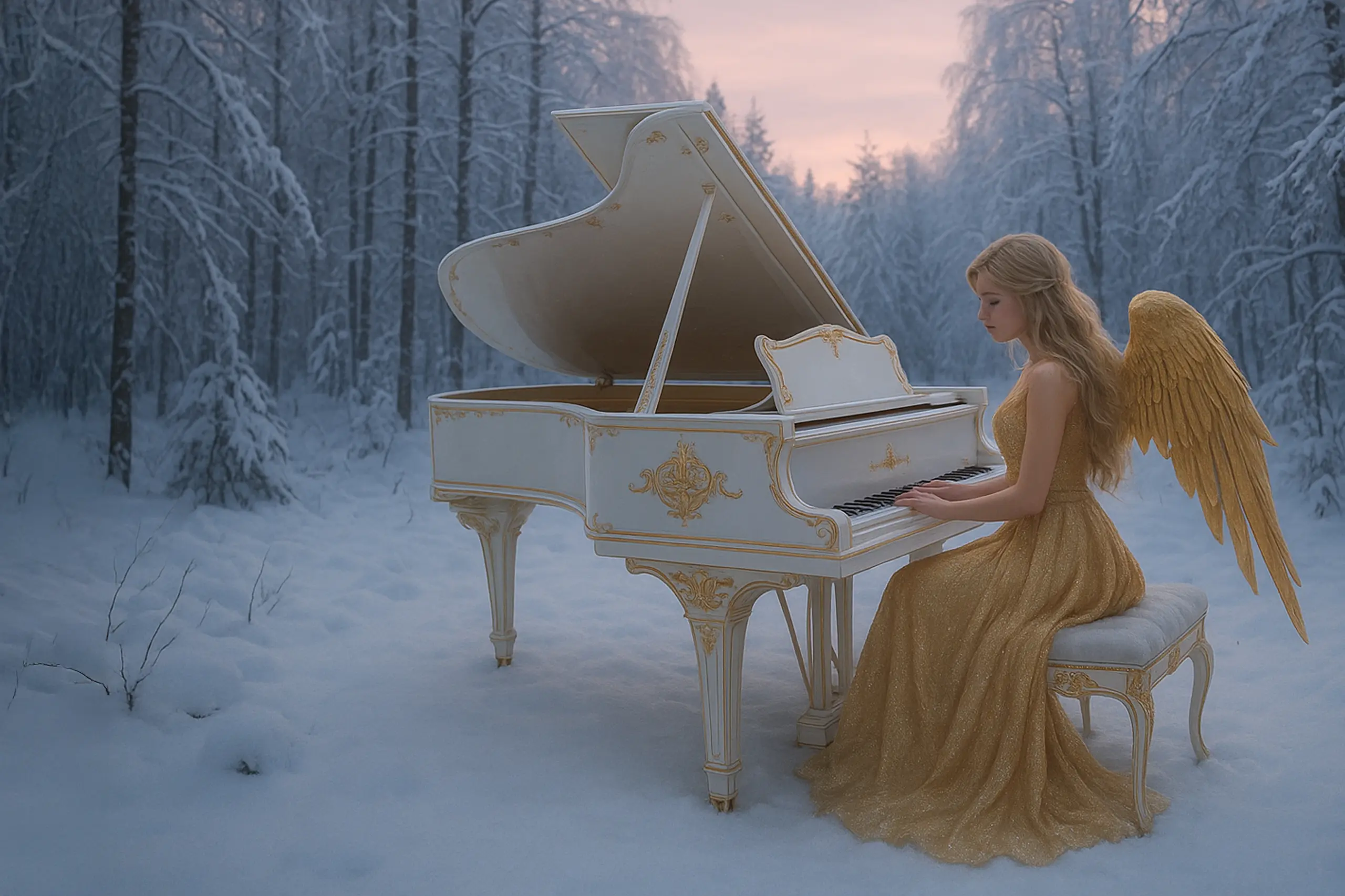 Eine himmlische Gestalt sitzt am funkelnden Piano,