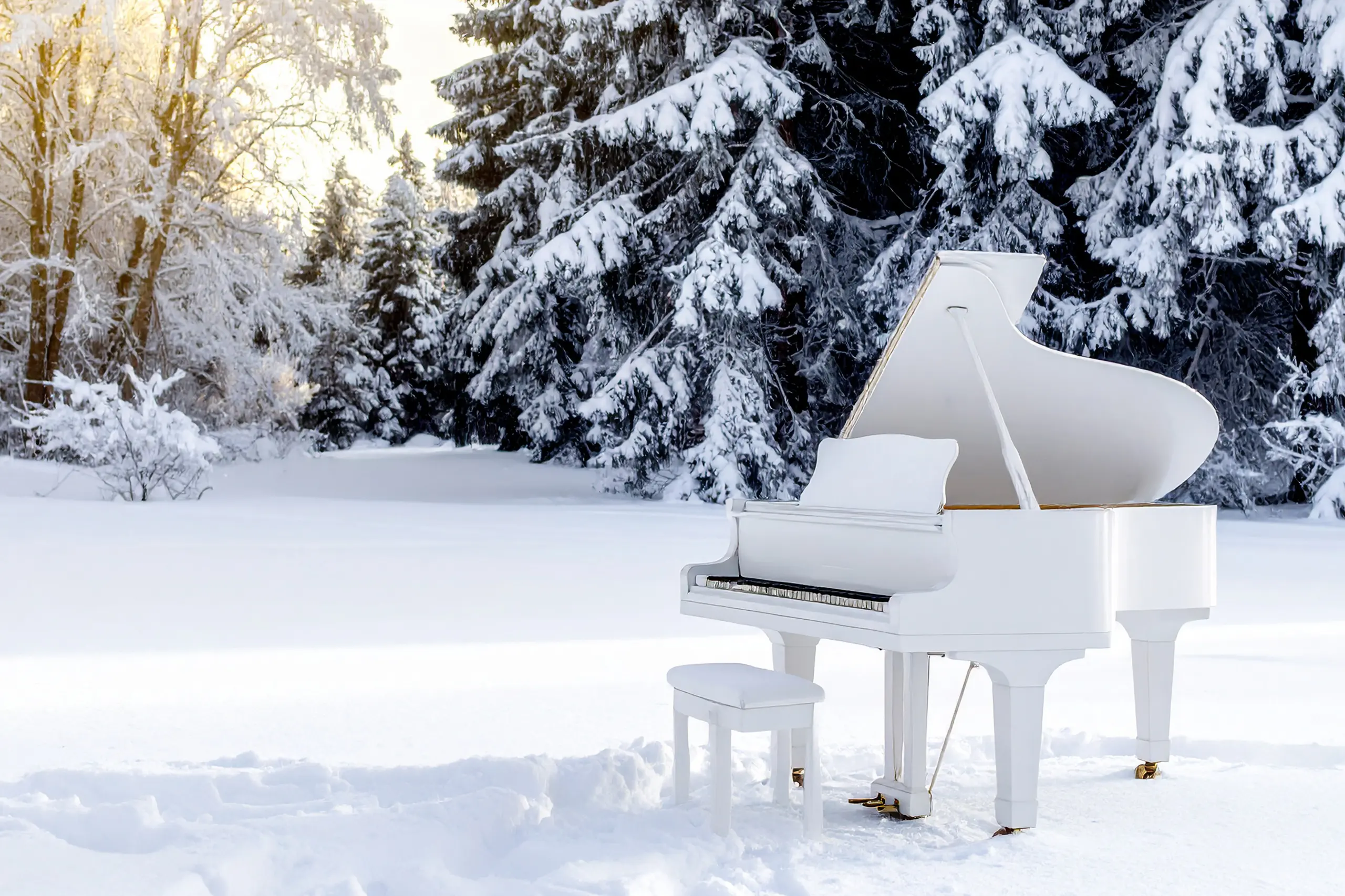 Dort, umgeben von schneebedeckten Wiesen und stillen Bäumen, setzt sie sich an ein Piano und spielt eine Sonate. Jede Note legt sich wie Balsam über die frostige Stille, und während ihre Hände über die Tasten gleiten, öffnet sich der Himmel. Warme Farben brechen durch die graue Winterdecke, tauchen das weiße Meer aus Schnee in goldenes Licht und verwandeln die Kälte in ein Bild von Trost und Hoffnung. So entsteht eine Szenerie voller Widersprüche – frostig und doch tröstend, einsam und zugleich strahlend, schwer und doch von einer fast himmlischen Leichtigkeit.