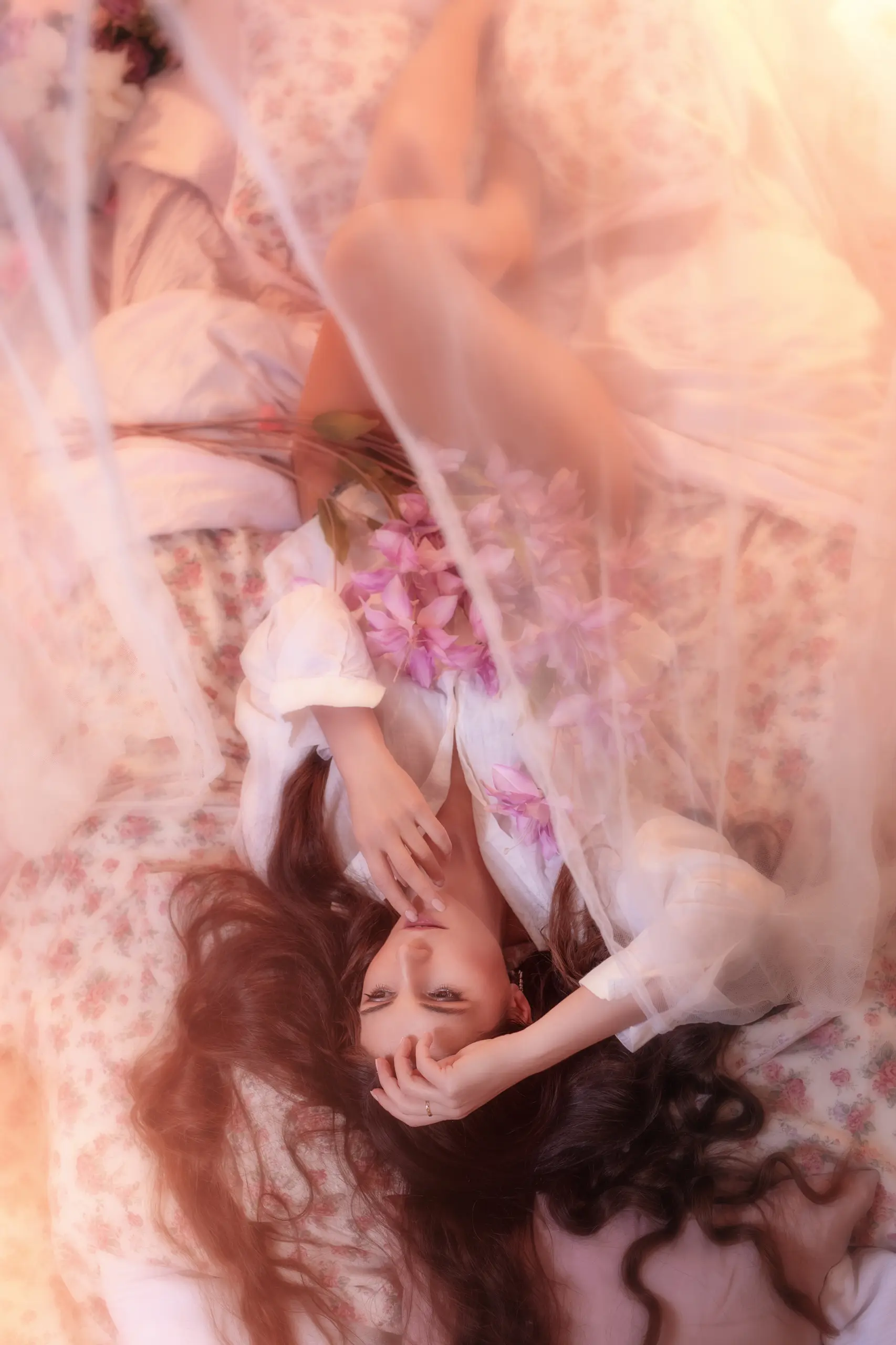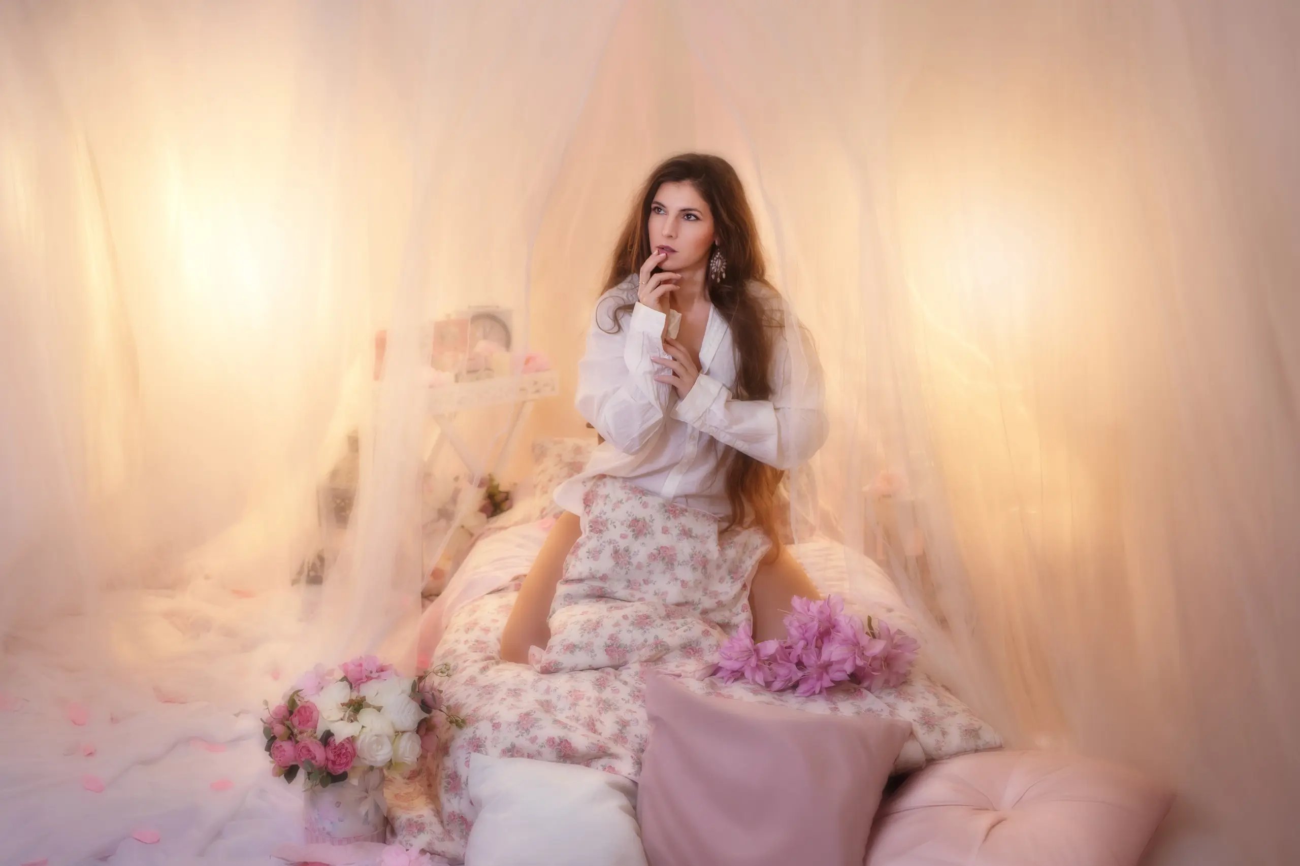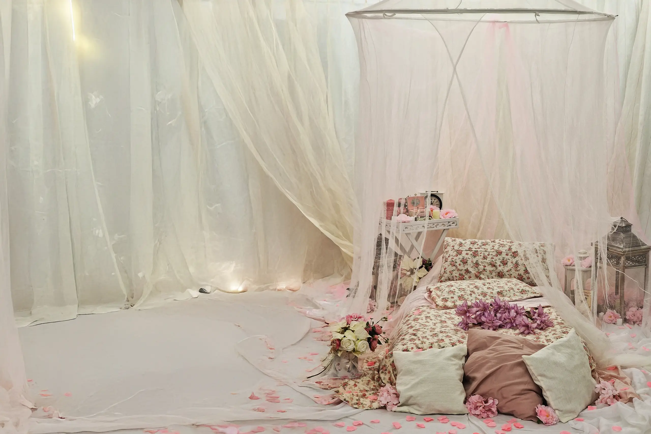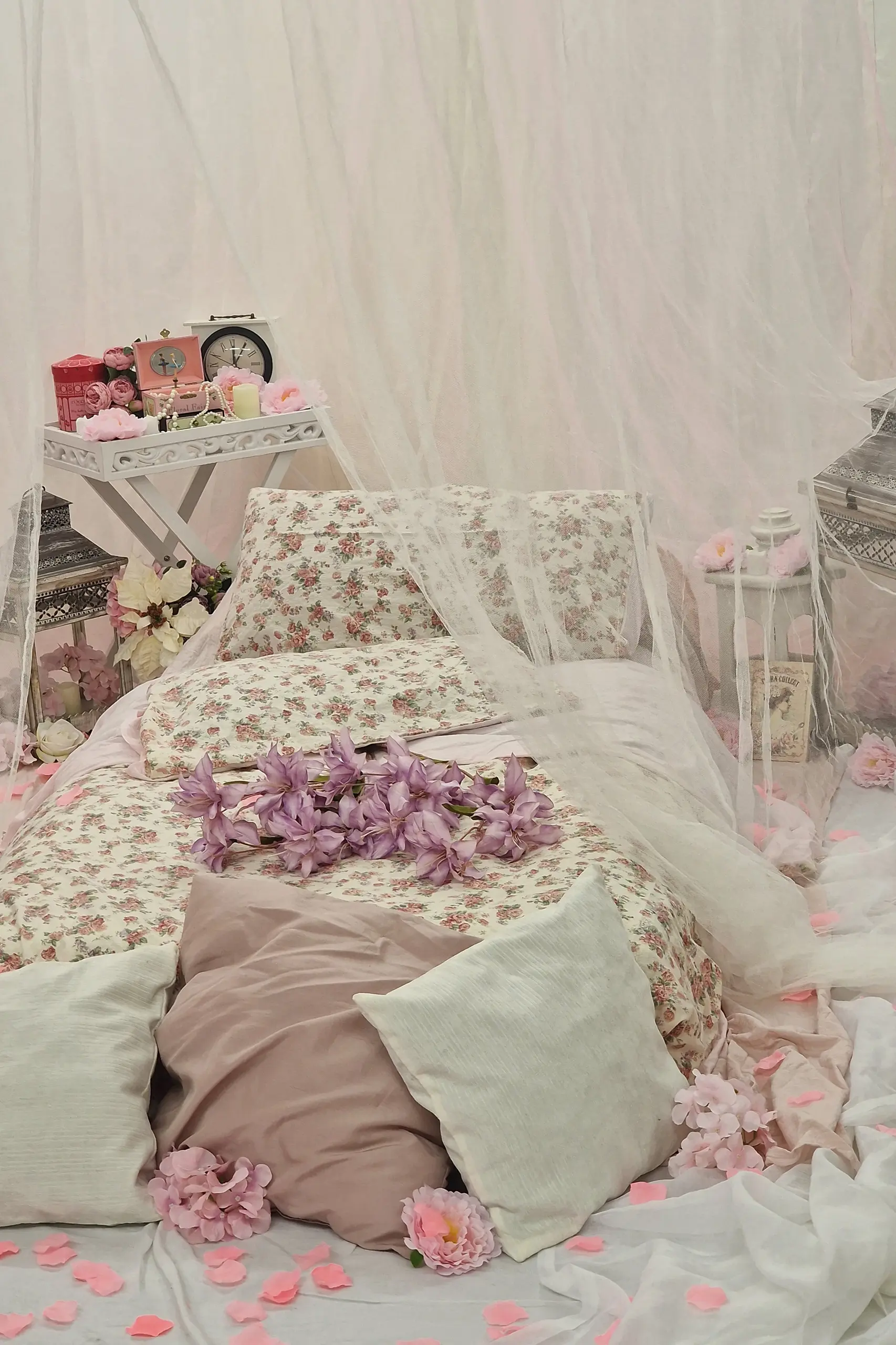 Sanfte Stoffe in Pastelltönen, weiche Kissen und eine Matratze, gebettet unter einem luftigen Himmelstuch. Dieses Studio-Set strahlt Ruhe, Nähe und leise Sinnlichkeit aus. Zarte Blumen, kleine Laternen und ausgewählte Vintage-Elemente fügen sich harmonisch ein und schaffen eine intime, verträumte Atmosphäre, in der Emotionen ganz natürlich entstehen dürfen.