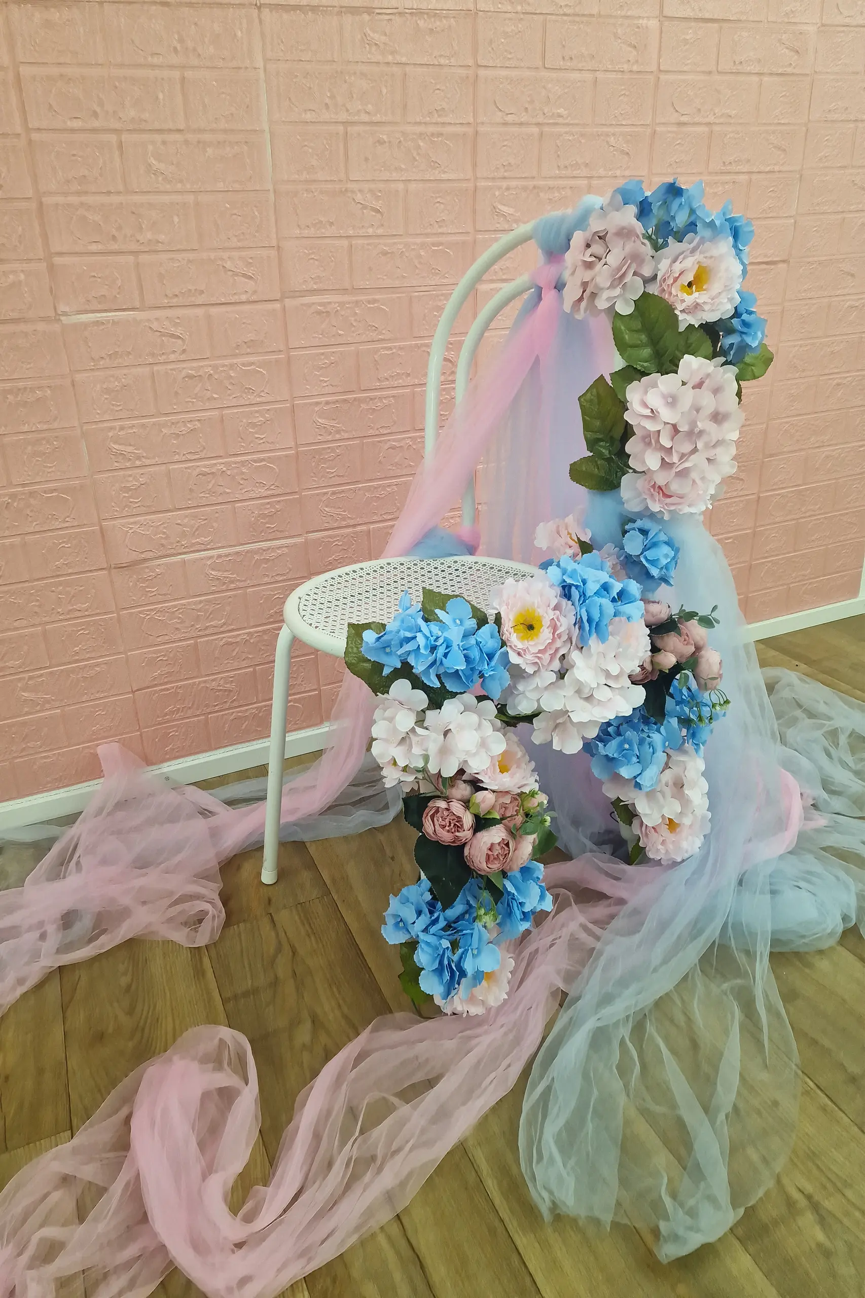 Direkt nebenan wartet das zweite Mini-Set: ein vintage Stuhl, liebevoll dekoriert mit pastellfarbenen Stoffen und Blumen. Reduziert, aber ausdrucksstark. Dieses Set lenkt den Fokus stärker auf Haltung, Ausdruck und Körpersprache – ideal für emotionale Portraits mit einer feinen, nostalgischen Note.