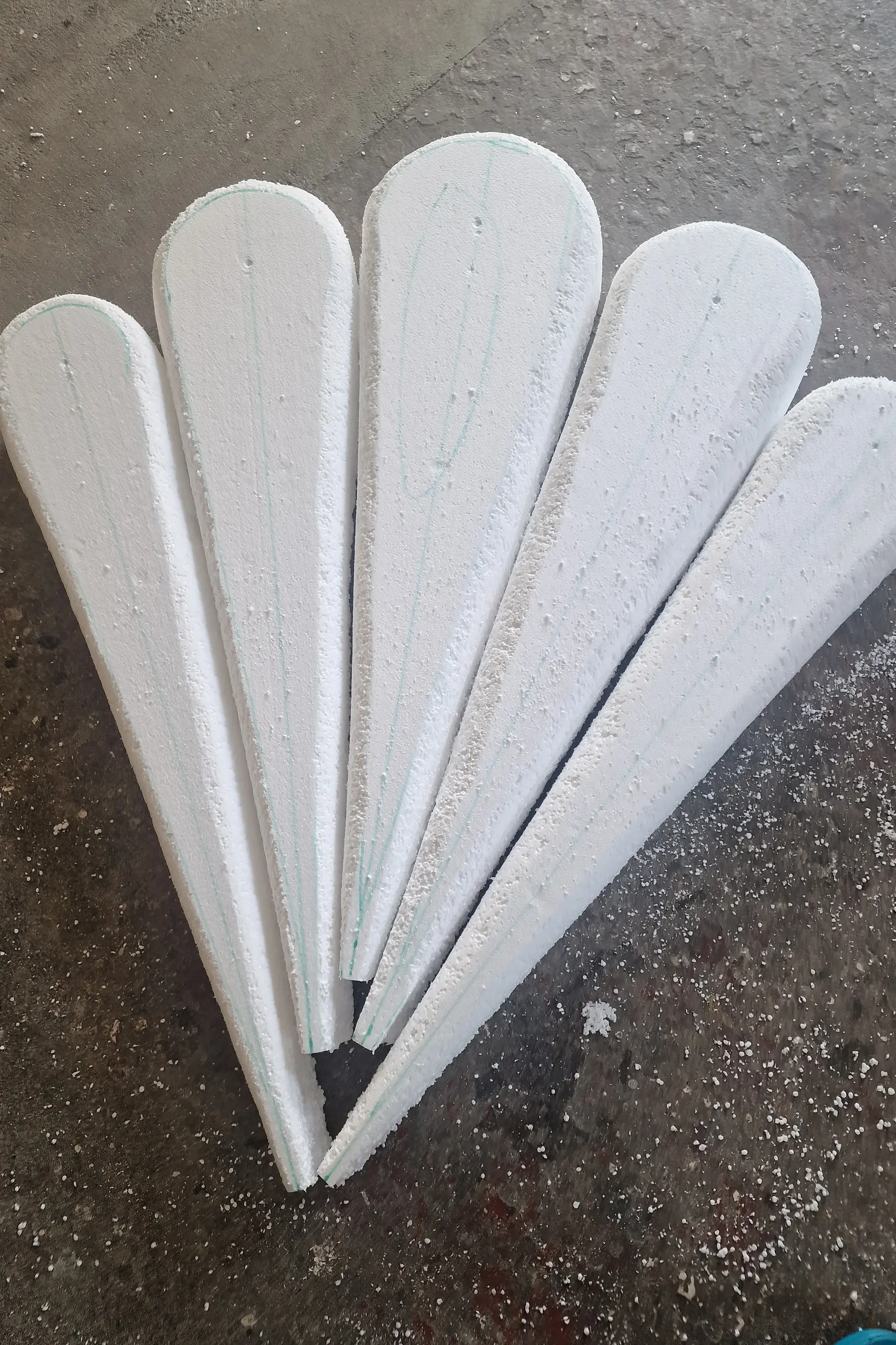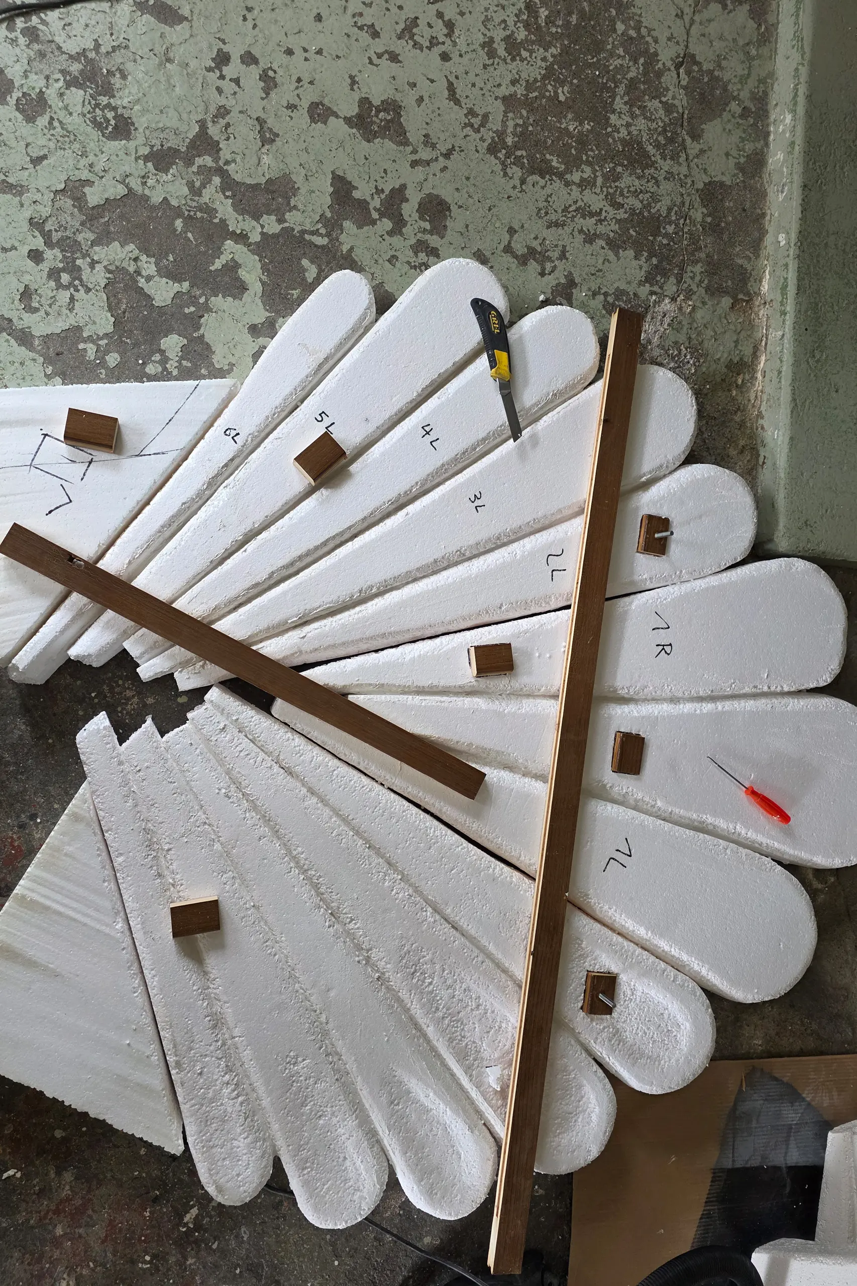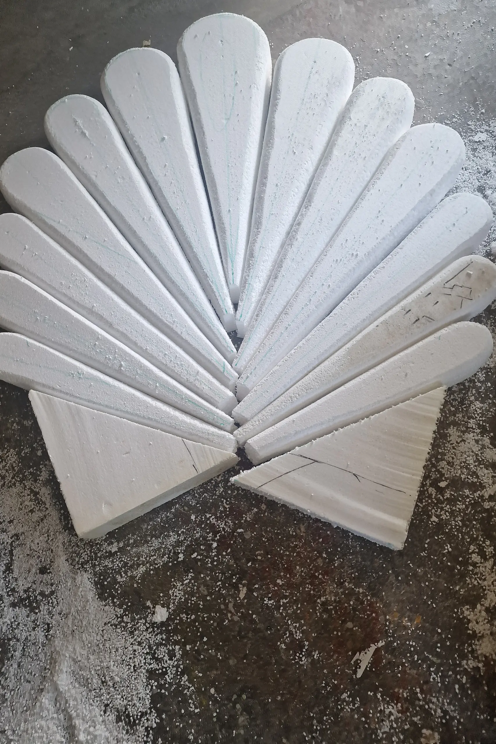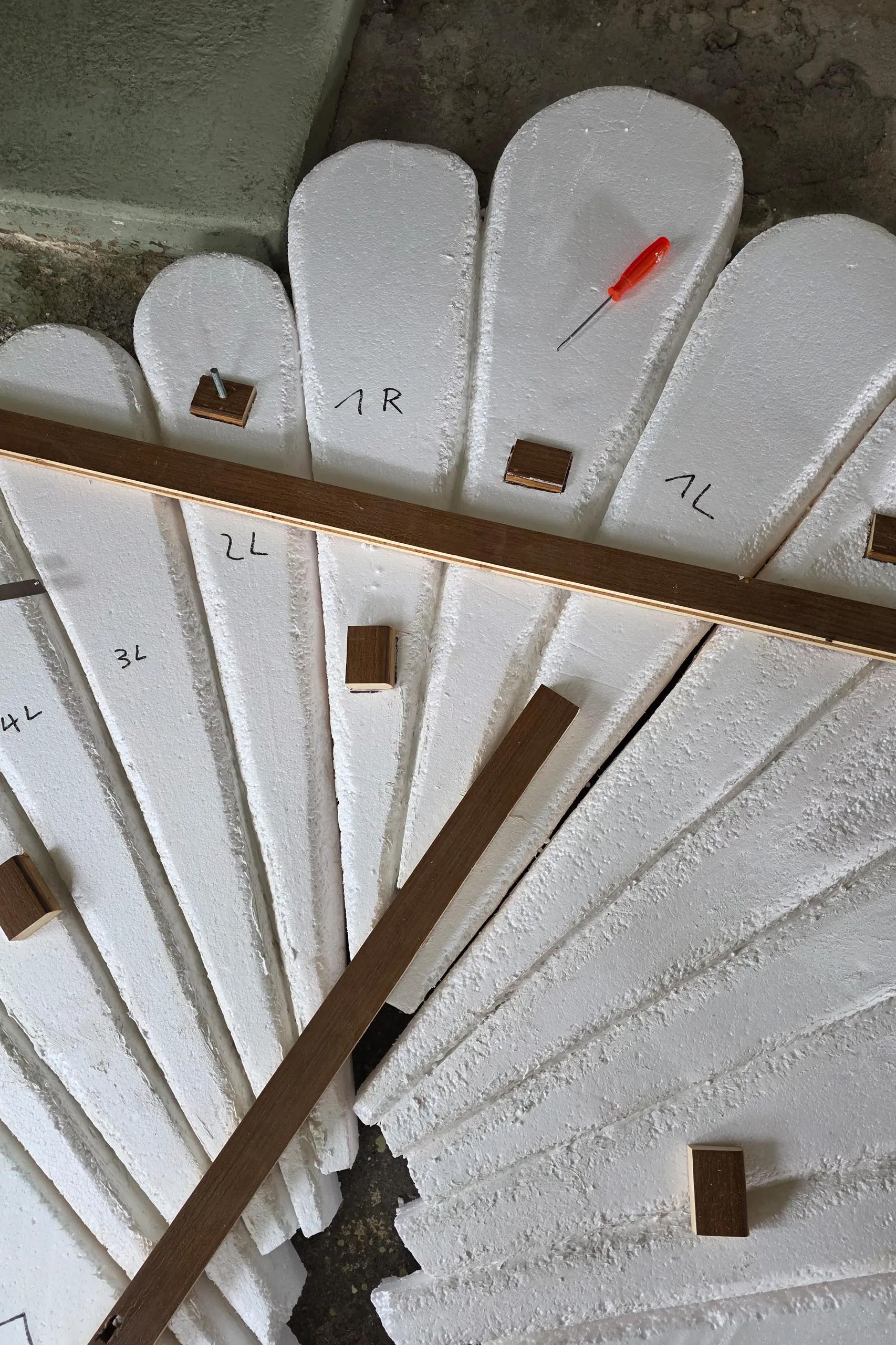 Zuerst wurden die einzelnen „Mantelstücke“ der Muschel grob zugeschnitten – oben breiter, unten schmaler, sodass sie im Halbkreis zusammenlaufen. Insgesamt entstanden so 13 Elemente für den Deckel und 13 für den Boden. Diese sollten später eine harmonisch gerundete, muschelartige Form ergeben.