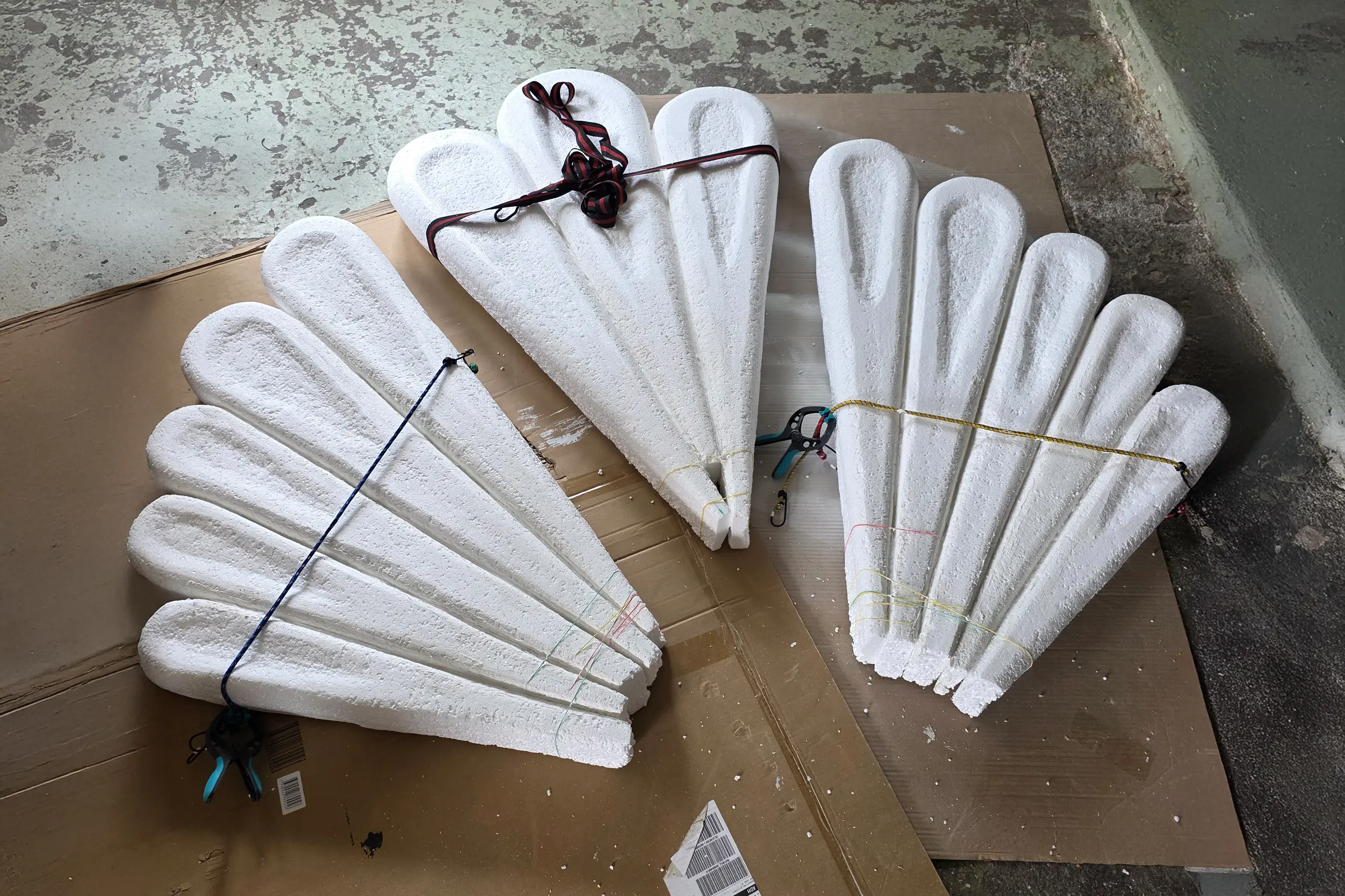 Beim Zusammenkleben der Segmente standen wir wieder vor einem logistischen Problem: 13 Teile pro Muschelhälfte – wie viele davon können wir fest miteinander verkleben, ohne dass das Segment zu groß zum Transport wird?