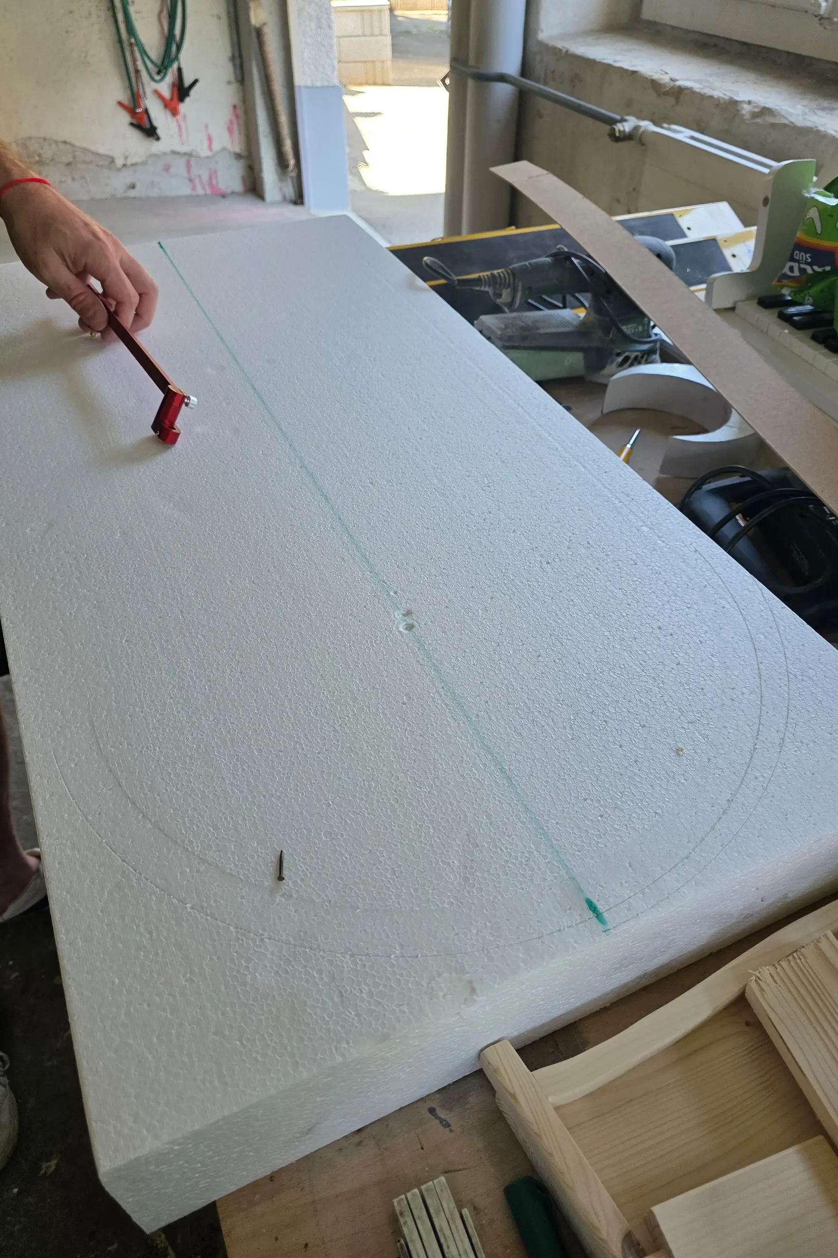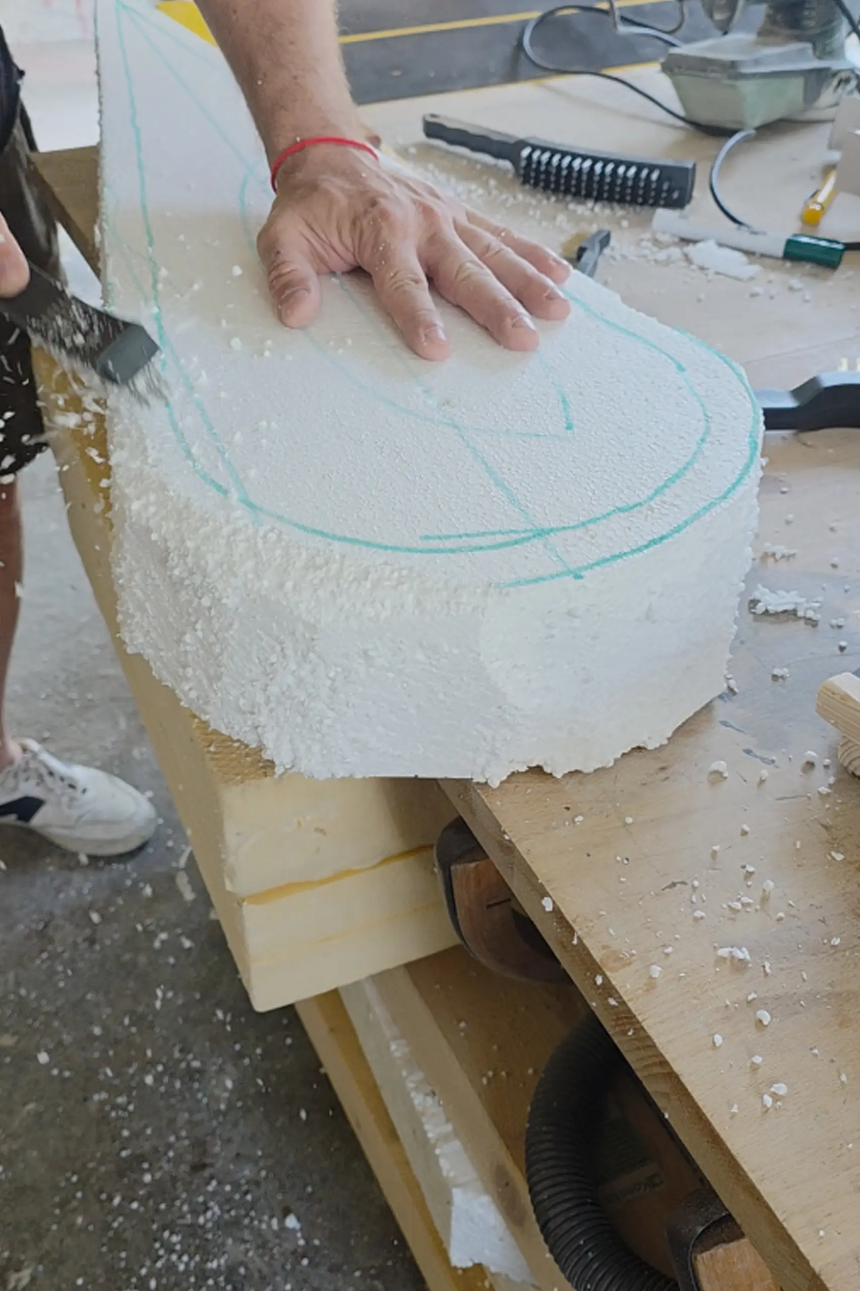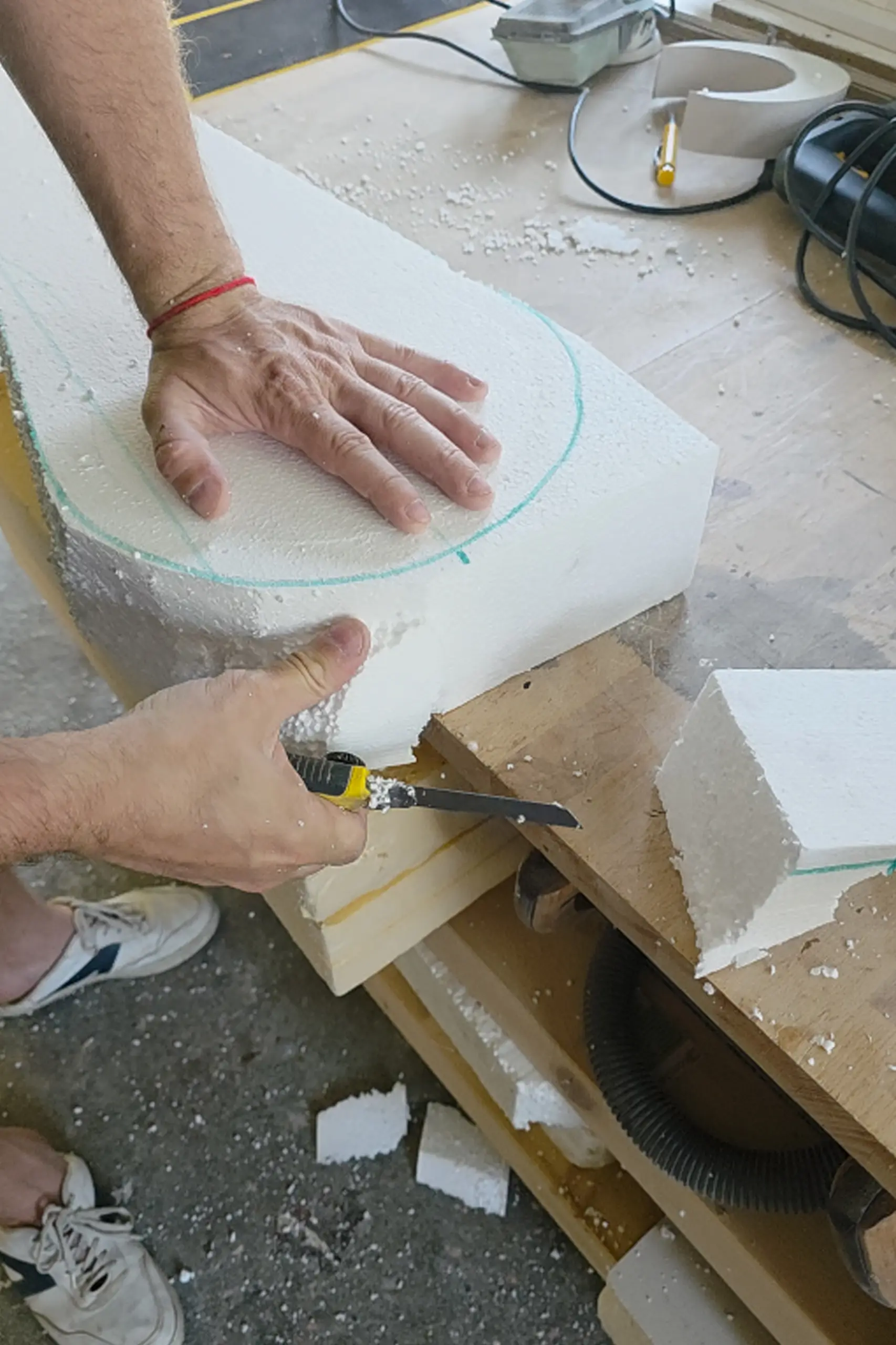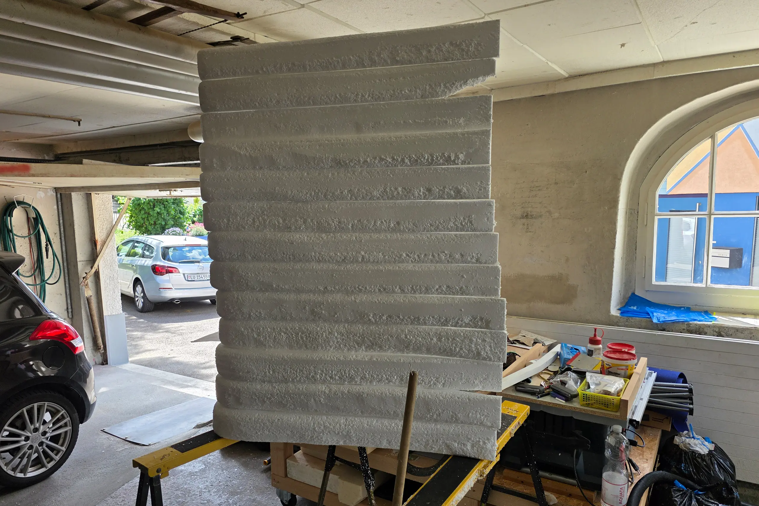 Wir begannen mit der eigentlichen Formgebung. Mit Cutter, Sägen und Stahlbürsten formten wir jede Platte: rund, leicht gewölbt und mit einer dezenten Aushöhlung, damit die spätere Muschelform nicht flach, sondern lebendig wirkt. Und ja – Styropor ist wirklich angenehm zu bearbeiten. Man sieht sofort Ergebnisse, Formen entstehen schnell.