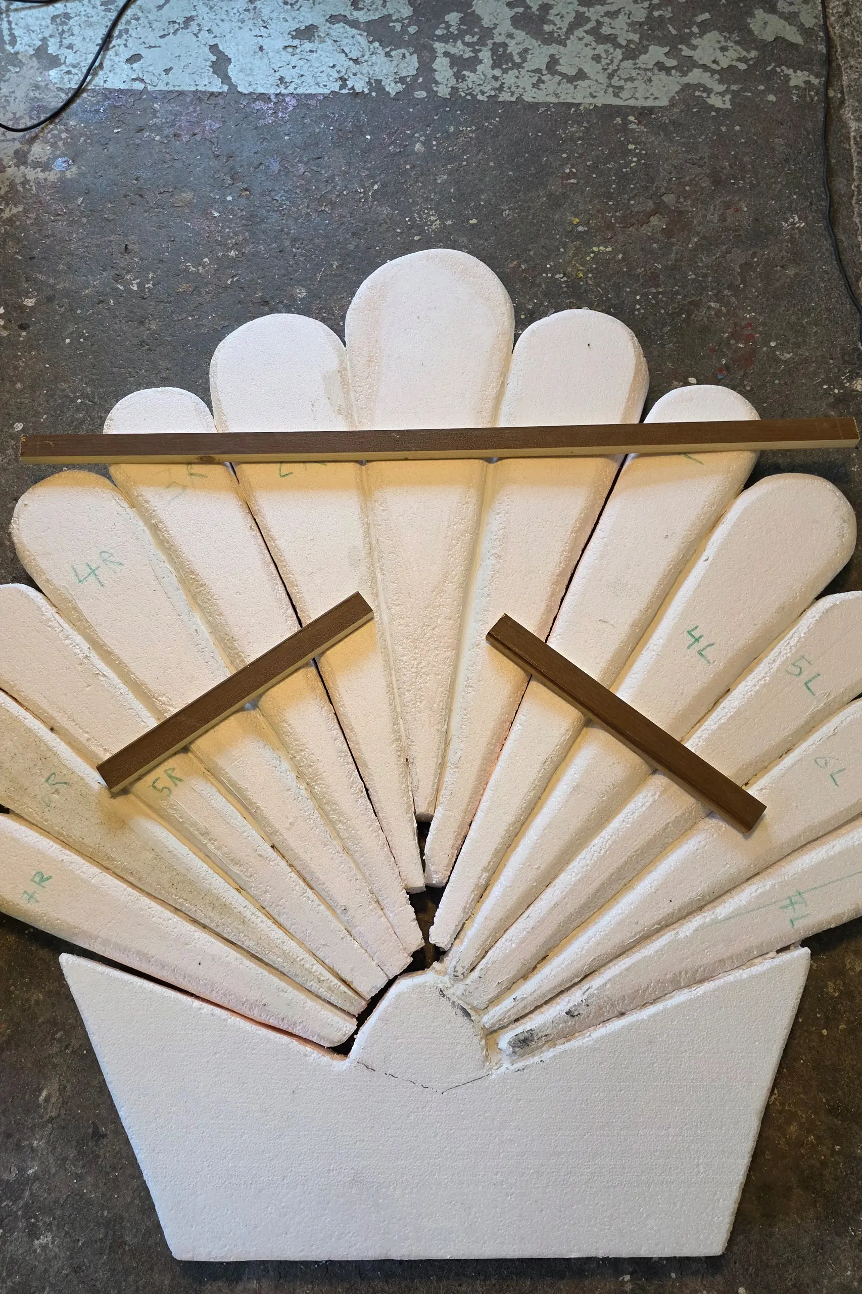 Nun brauchten wir eine Möglichkeit, die drei Segmente jeder Muschelhälfte stabil miteinander zu verbinden – und zwar so, dass man die Verbindung später nicht sieht. Schrauben in Styropor? Keine gute Idee.