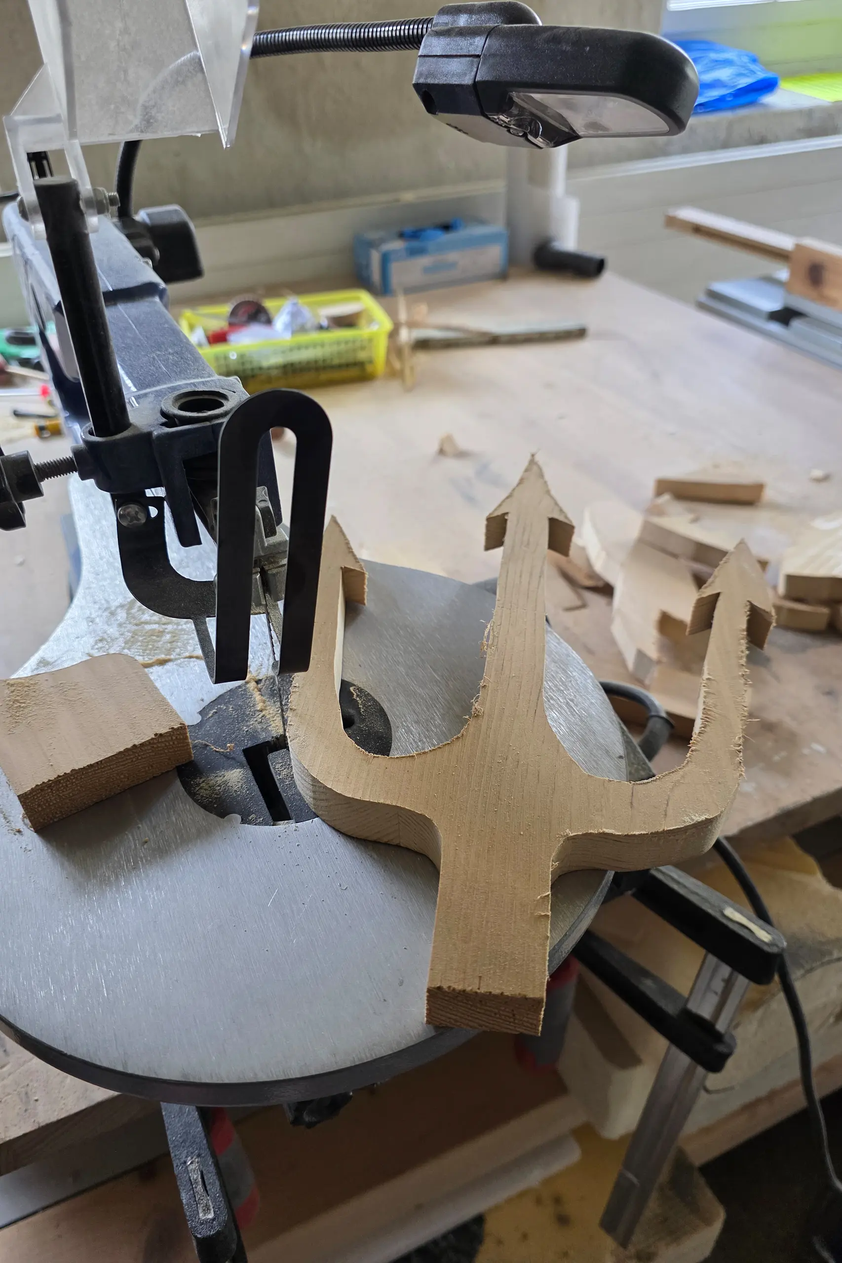 Neben der Muschel entstand parallel auch ein klassischer Dreizack als Requisite. Die Basis war eine schlichte Holzkonstruktion, die wir sorgfältig zurechtgesägt und zusammengesetzt haben. Anschließend wurde er mit metallic-goldenem Spray lackiert, wodurch er einen edlen Glanz erhielt. Zum Schluss kamen noch kleine, dezente Muschelapplikationen hinzu, die dem Dreizack den letzten Schliff gaben und ihn perfekt in das maritime Setting einfügen.